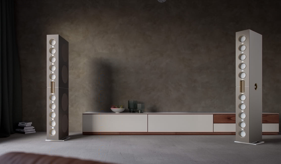 Eine spezielle Rahmenfußkonstruktion aus Stahl sorgt für den optischen Eindruck einer schwebenden Skulptur, die trotz ihrer 1,7 m Höhe nicht den Raum dominiert. Eine besonders hochwertige Lackierung, abgesetzte Einfassungen der Treiber sowie eine scheinbar schwebende Montage der Schallwand und Seitenwände sorgen für zusätzliche Leichtigkeit im Auftritt. Beliebige Kombinationen von Lackfarben, Oberflächen der Treiberumfassungen und Nute sind in der Individual-Edition erhältlich.