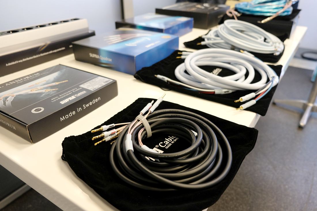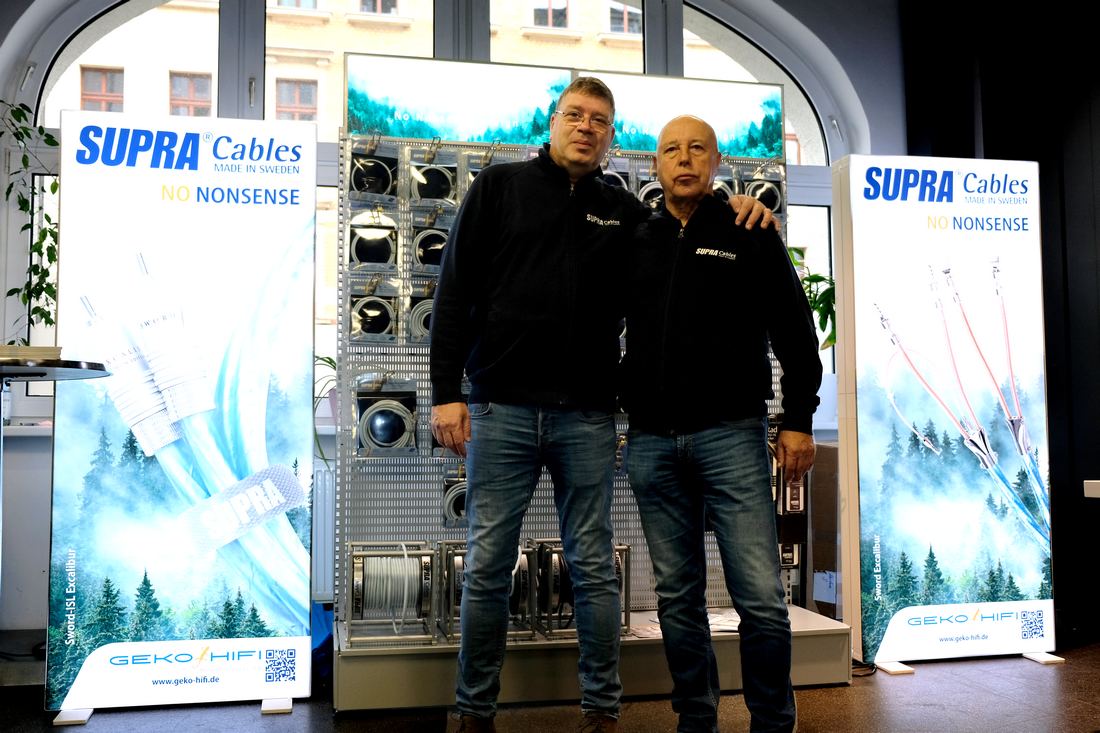 Strategisch günstig wie immer direkt am Eingang Stefan Eisenhardt mit seiner Ausstellungswand von Supra Cables. Ebenfalls mit dabei war Gerd Kopistecki, welcher den deutschen HiFi-Vertrieb GeKo-HiFi ursprünglich gründete. Schön, dass er den Stefan mit Rat und Tat noch unterstützt. Auch mit dabei in Leipzig Supra Cables Lautsprecherkabel XL Annorum in schwarz, die es in dieser Farbgebung aktuell nur in Deutschland, Österreich und der Schweiz gibt. Erhältlich sind diese in den gleichen Konfektionslängen wie die normalen eisblauen, einen Preisunterschied gibt es nicht bei Schwarz oder Eisblau.