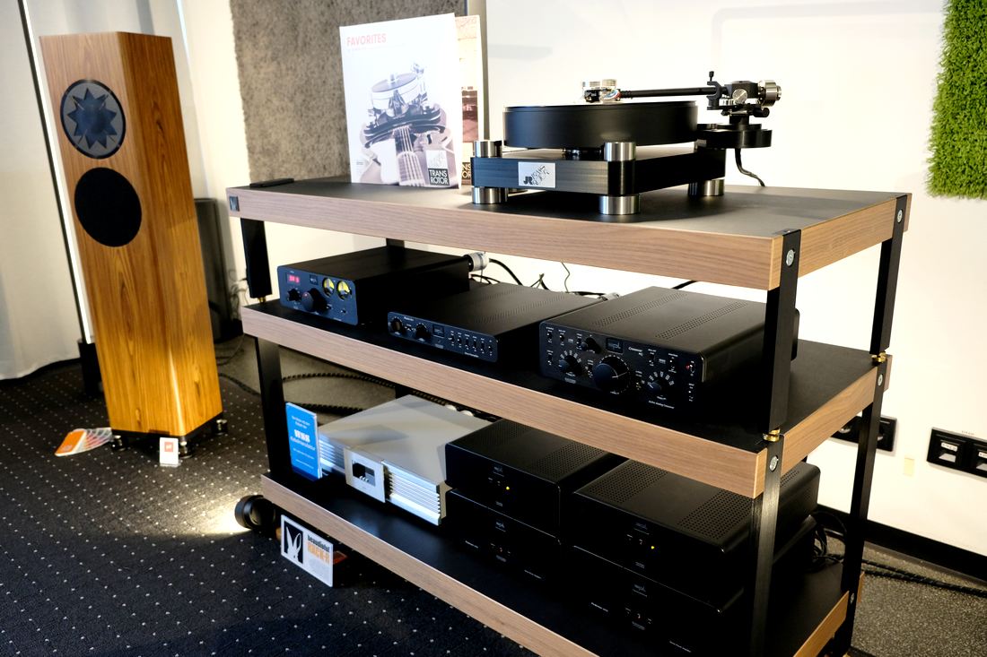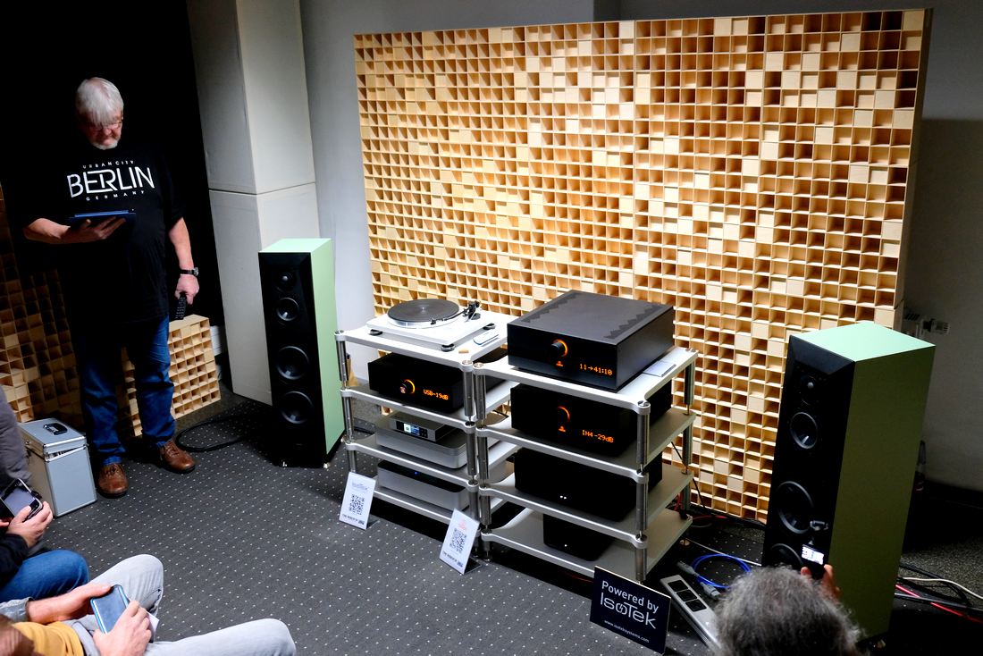 Der Hamburger HiFi-Vertrieb Drei-H fuhr im Gegensatz zu den Vorjahren hier in Leipzig nur ein kleines Besteck auf. So ungefähr die halbe Größe eines ausgewachsenen Mannes weisen die kompakten Standlautsprecher Spendor A7.2 für 5.000 Euro das Paar auf. Und der neue die Spendor antreibende integrierte Verstärker Lyngdorf TDAI-2210 mit Room Perfect für die Raumkorrektur ist rein optisch gesehen auch nicht der größte, ihn zu kaufen gilt es ab 4.000 Euro. Optional gibt es einen MM-Phono-Vorverstärker für plus 500 Euro dazu, oder alternativ ein HDMI 2.1 Modul für 800 Euro, beides zusammen geht allerdings nicht. Insofern hatte der ganz unten im Rack stehende SPL Phono Preamplifier seine Berechtigung, schließlich galt es auch noch den bei Drei-H neu im Vertrieb vorhandenen Takumi TT Level 2.1 Plattenspieler für 1.800 Euro anzuschließen. Wer nun der Meinung war, dass so eine kleine HiFi-Anlage nichts sei für den relativ großen Raum, der wurde mit dem dynamischen und großzügigem Klang schnell eines Besseren belehrt.