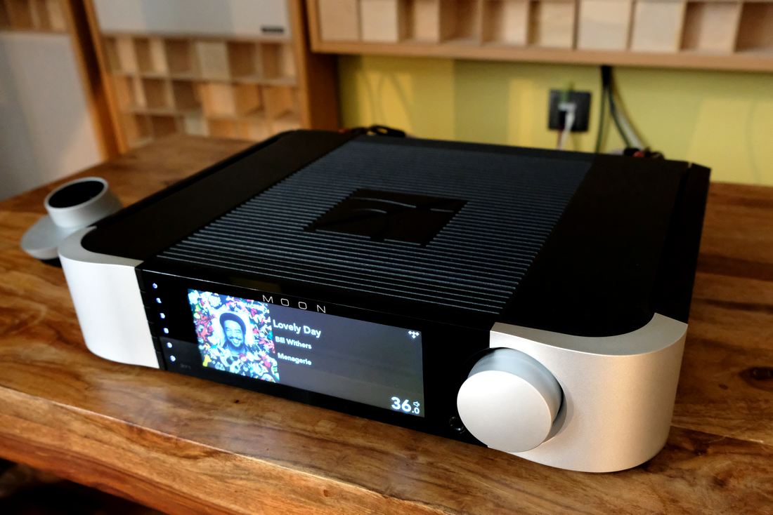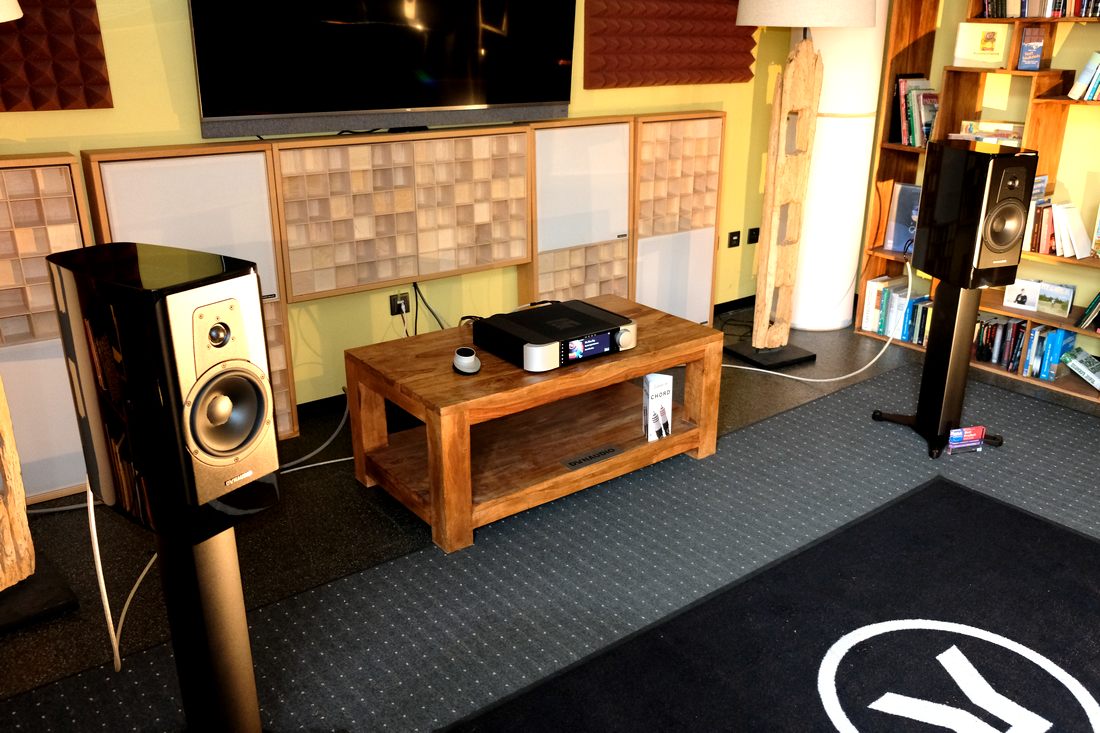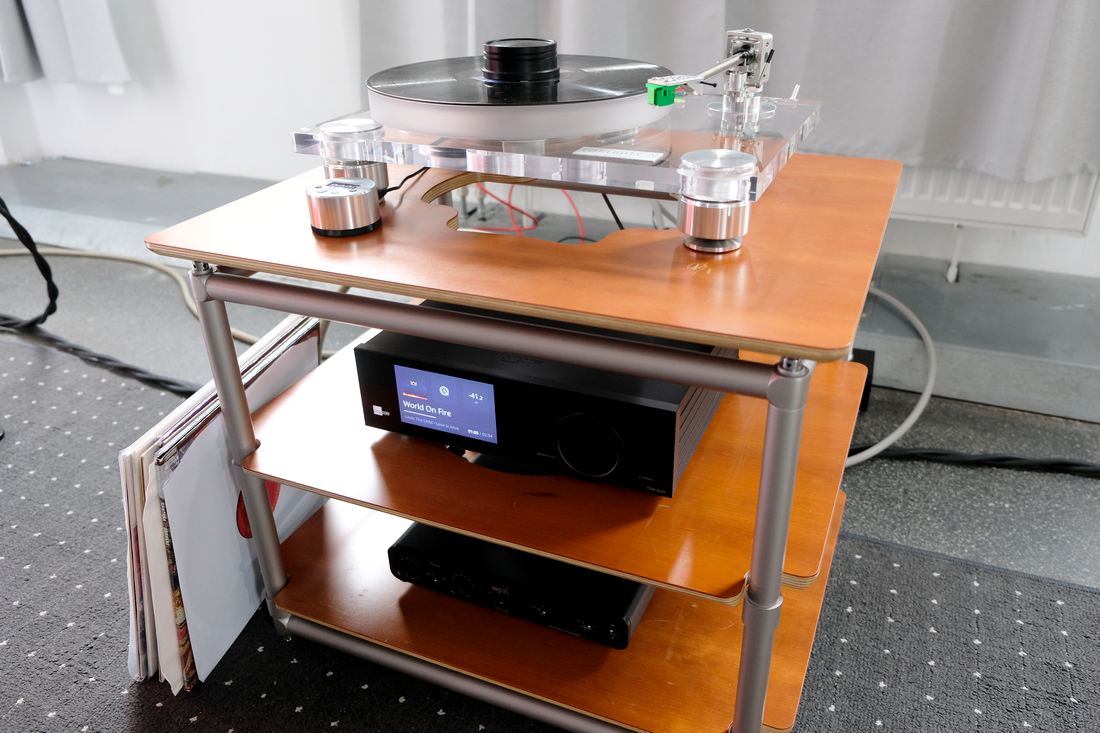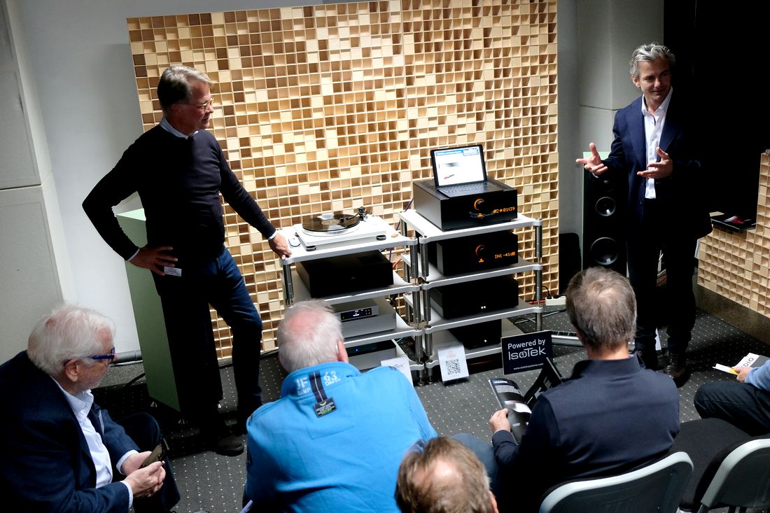 Im wie immer akustisch optimierten Raum: Die Kompaktlautsprecher Dynaudio Contour 20 Black Edition für 7.000 Euro das Paar am Moon 371 Streaming-Vollverstärker für 6.800 Euro, der neben seiner Funktion als Netzwerkplayer auch einen integrierten Phono-MM und MC-Vorverstärker besitzt. Wie gewohnt bei Dynaudio der eher kontrollierte und neutrale Klang.