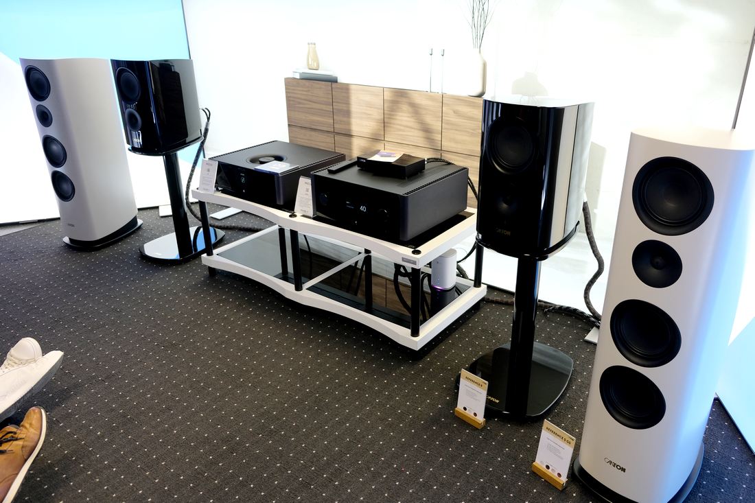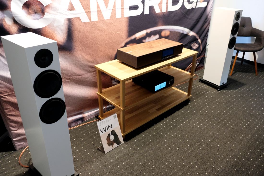 Gleich nebendran traf ich auf mir bekannte schlanke Standlautsprecher, die Audio Physic Classic 8 (Test) für 2.700 Euro. Untenrum kräftig, so wie ich sie kannte, hier in Leipzig jedoch etwas trockener, ansonsten recht ähnlich meinem damaligem Klangeindruck. Was entweder am Raum gelegen haben mag, oder dem hier verwendeten Streaming-Verstärker Cambridge Audio EVO 150 SE für 2.400 Euro. Ganz oben im HiFi-Rack die Cambridge Audio Evo One, eine All-In-HiFi-Anlage für 1.500 Euro.