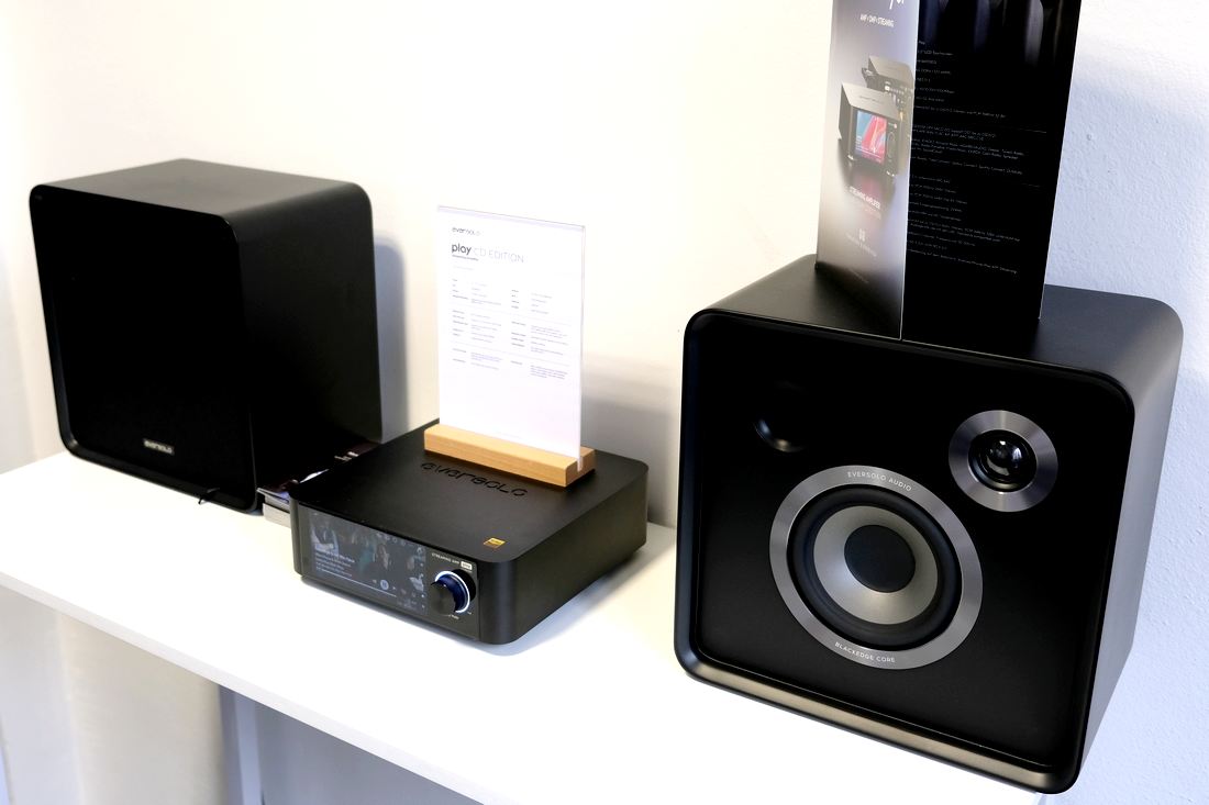 So, hoch und ab in die erste Etage. Im kleinen Raum gastierte Carsten Hicking von audioNEXT, der auf dem Tisch dann doch so einige Kopfhörerverstärker von Luxsin und Eversolo an Dan Clark Kopfhörern präsentieren konnte. Die Hauptattraktion war natürlich der nagelneue Eversolo DAC-Z10 für knapp 2.000 Euro, der so einiges an analogen wie auch digitalen Eingängen – darunter ein HDMI-ARC – mitbringt, und sich natürlich auch an Endstufen anschließen lässt. Auch in der Vorführung der Eversolo DMP-6 GEN 2, den wir erst kürzlich zum Test bei uns hatten. Etwas unscheinbar an der gegenüberliegenden Wand der Eversolo Play als CD-Edition für 800 Euro, mit Prototyp-Regallautsprechern, die praktischerweise größenmäßig auf das Kallax-Regal abgestimmt waren.