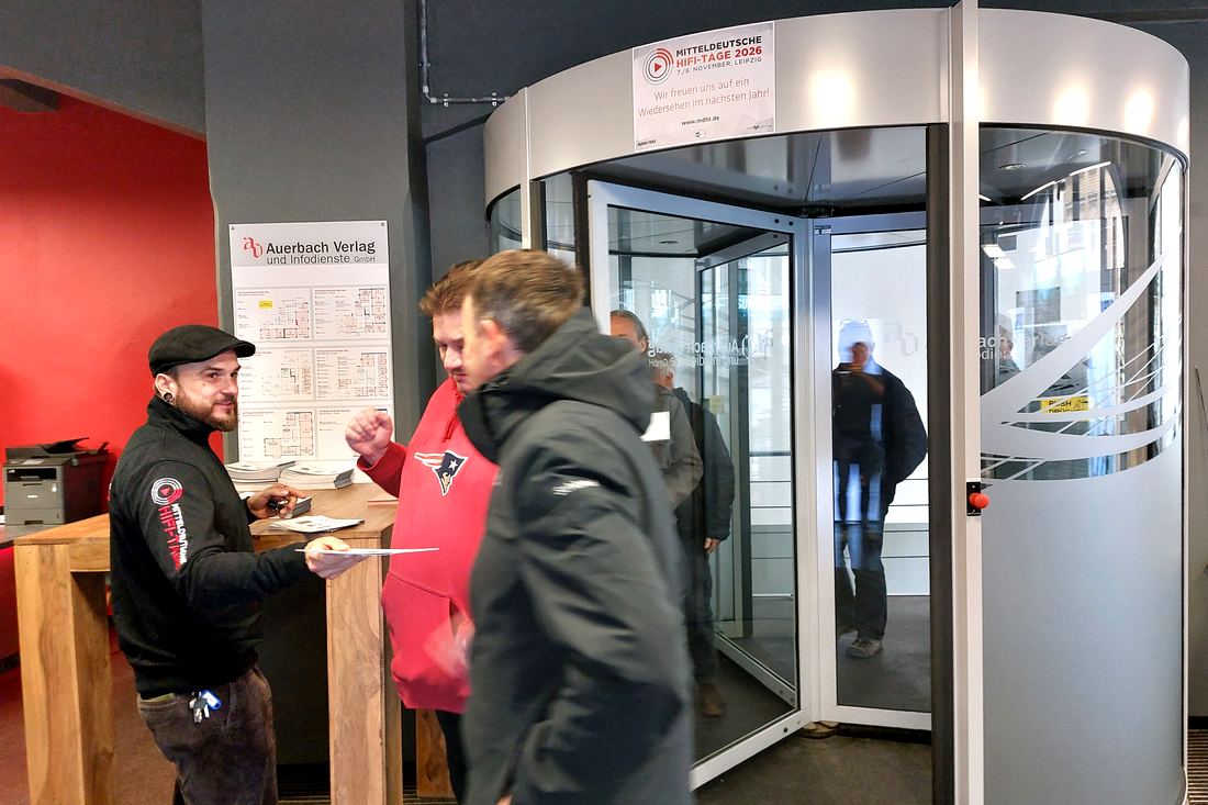 Ab durch die Drehtür, gleich am Eingang empfing mich ein Mitarbeiter der Mitteldeutsche HiFi-Tage 2025, der einem mit der rechten Hand erstmal locker ein Programmheft in die Hand drückte. Und gleichzeitig mit der linken einen Zähler, mal schauen, wieviel Besucher dieses Jahr wohl auf die HiFi-Messe kommen. Also ich war ja schon gespannt auf das Ergebnis… So einige Besucher strömten an mir vorbei gleich zum Treppenhaus und ab nach oben, mein Geheimtipp, von oben nach unten zu gehen, schien wohl keiner mehr zu sein, so ist das halt mit den Geheimtipps… Daher änderte ich meinen Plan, und fing heute unten im Erdgeschoss an.