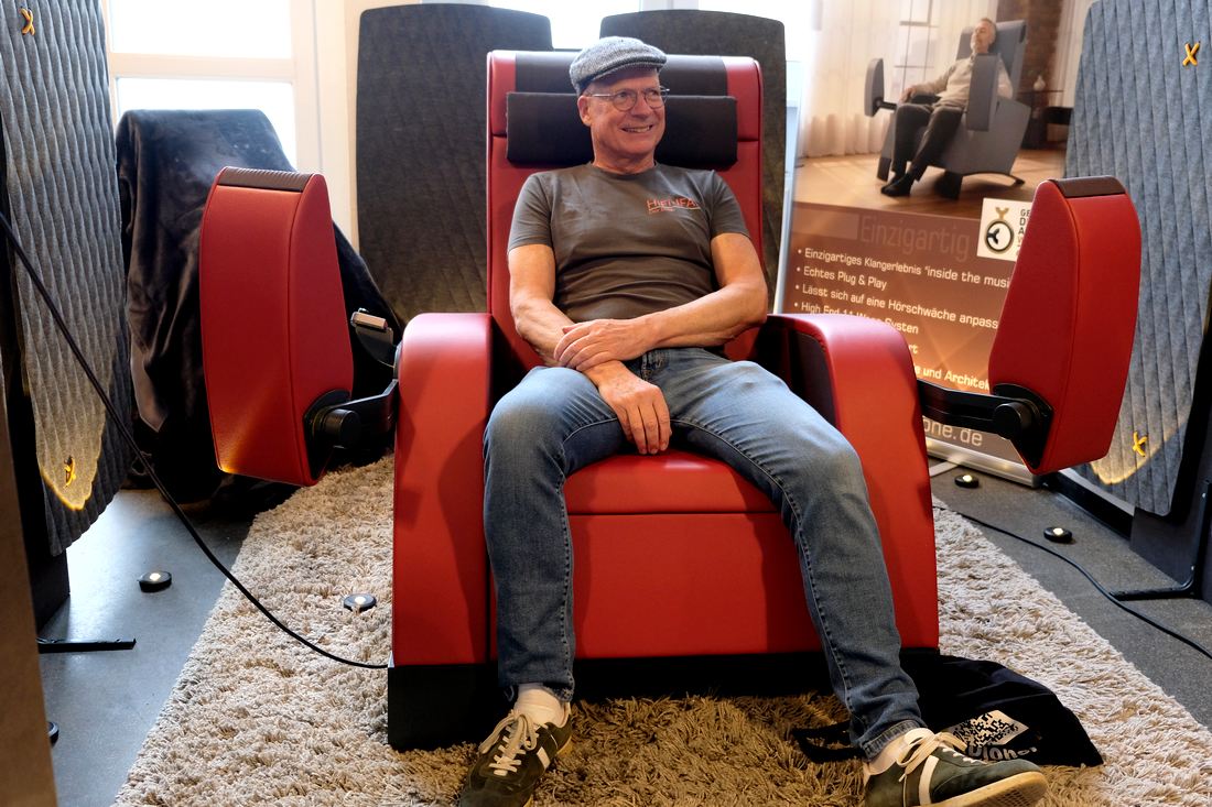 In Darmstadt war der HiFi-Sessel begehrt, hier auf den MDHT 2025 hatte ich Glück, und konnte auf dem Sonic Throne Platz nehmen. Irgendwie kam ich mir da wie in einem überdimensionalem Kopfhörer vor, der nicht auf den Ohren drückt. Und der einem dann noch ordentlich den Hintern massiert beim Bass. Eine interessante Konstruktion von Markus Schönrock und Norbert Reinhardt. Und der Sessel muss nicht rot sein, es gibt auch jede Menge andere Farben in Stoff und Leder.