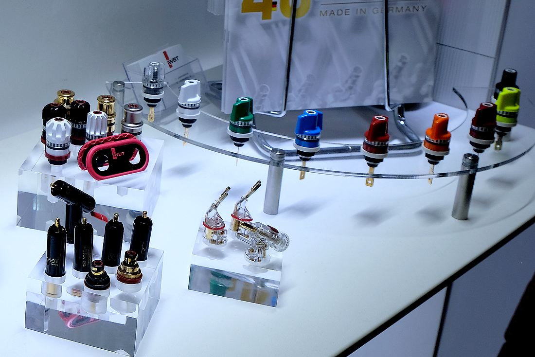 Ein wirklich sehr großes Angebot an Cinchsteckern und den dazugehörigen Buchsen hatte WBT im Angebot. Dazu vielerlei Polklemmen für Lautsprecher, Kabelschuhe wie auch Bananenstecker. Vom Aufbau und Qualität der gut gemachten Produkte konnte man sich auf den MDHT 2025 selber überzeugen und informieren lassen.