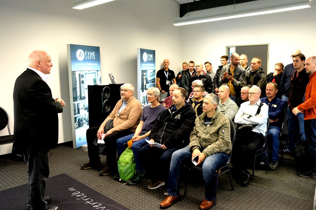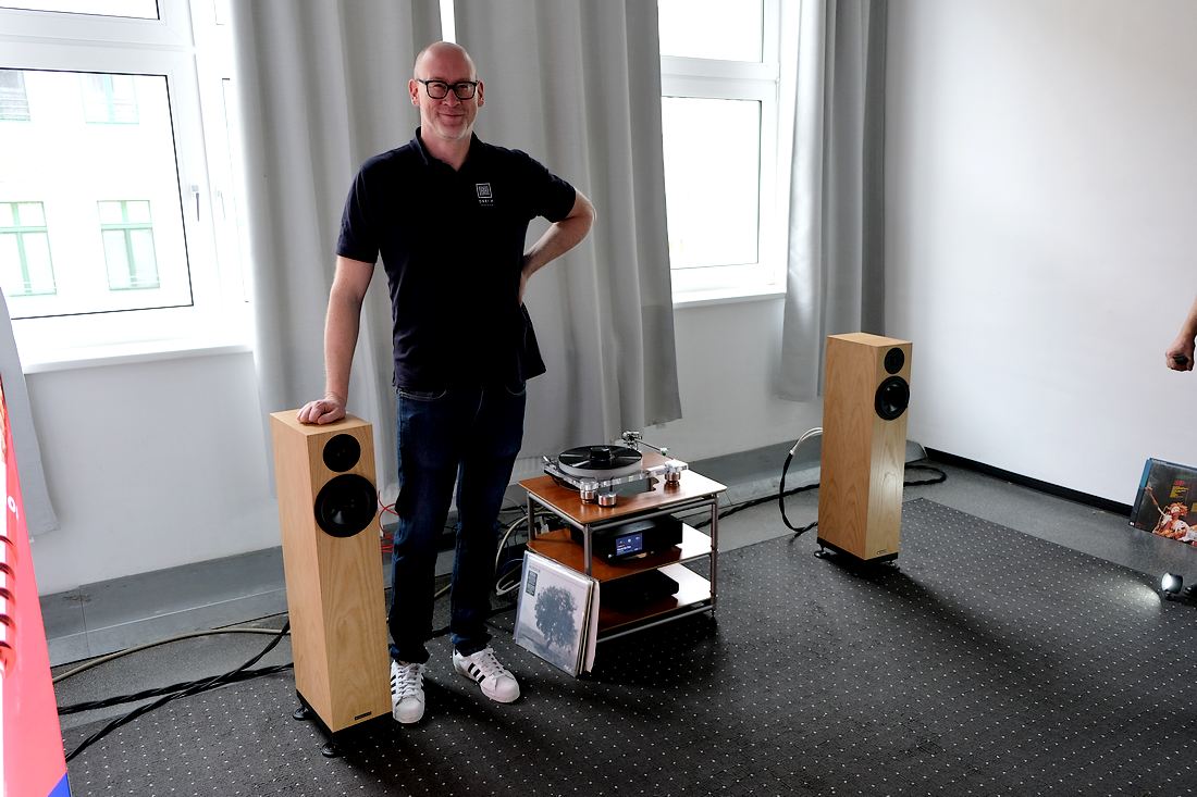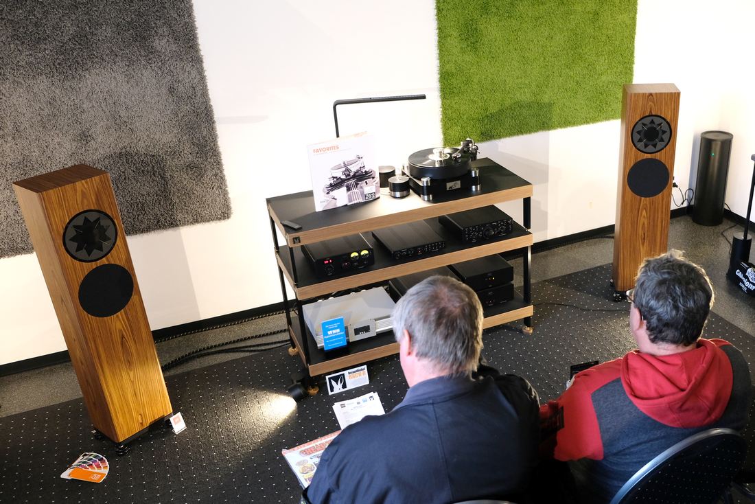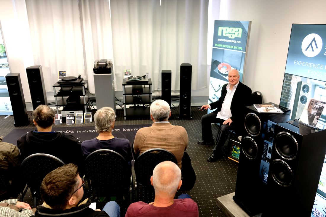 Rein zum TAD-Audiovertrieb, Musik hören, vorgeführt von Lothar Brandt, der gerade ein kleines Päuschen seiner informativen und unterhaltsamen Darbietungen einlegte, bei meinem Eintreten dann jedoch wieder den von ihm gewohnten Schwung und Elan aufnahm. Den Takt gab während meiner Anwesenheit der Plattenspieler Rega Planar 3RS Edition mit dem MM-Tonabnehmer Nd5 – das solo 400 Euro kostet – inklusive dem PSU MK2 Netzteil für 1.300 Euro vor. Angeschlossen am Vollverstärker Rega Brio MK7 (Test), der mit seiner Phono-MM-Stufe sowie integriertem DAC bei 1.000 Euro liegt. Zu Gehör kam der anmachende Klang dann über die schlanken Standlautsprecher Fyne Audio F501E für 1.200 Euro das Paar. Zusammen mit den Atlas Cables eine ansprechende HiFi-Anlage.