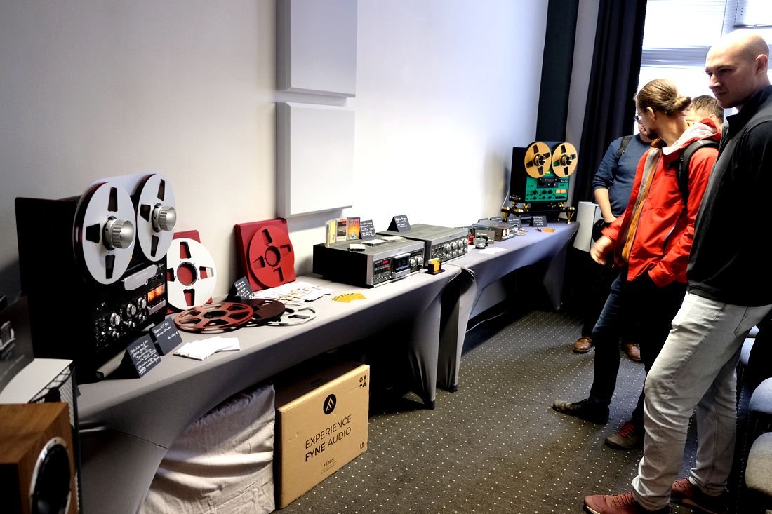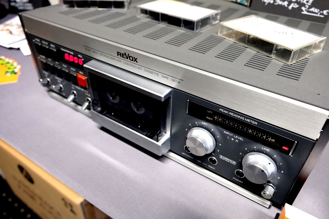 Ey, das dreht! Die Tonbandfreunde führte Bandmaschinen von Revox vor, und deren kleineren Ableger, das Tape Deck Revox B710 MKI, von dem ich in meiner Jugendzeit nur träumen durfte, rechterhand dann der Verstärkerklassiker Revox B750. Gehört habe ich hier nicht, aber rein optisch passten die neuen Regallautsprecher Fyne Audio F500S für 1.000 Euro gut dazu.