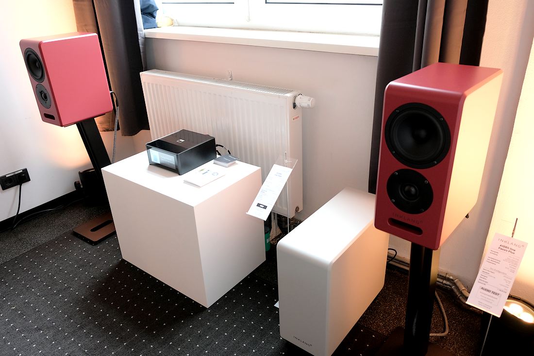 Für die großen neuen Standlautsprecher INKLANG Ceterra 70R Black Edition war der vorhandene Raum doch ein paar Nummern zu klein. Also machte Thomas Carstensen aus der Not eine Tugend, und brachte seine passiven Regallautsprecher INKLANG Ayers One (Test) für 1.800 Euro das Paar sowie den neuen schlanken Subwoofer INKLANG Ayers Sub Slim für 1.400 Euro mit Downfire-Bass mit. Musikalisch versorgt wurden die drei vom Streaming-Verstärker NAD M10 V3 für 2.600 Euro. Mit ihrer räumlichen Darstellung, der guten Auflösung und dem trockenen Bass eine gute Wahl. Gut unterscheidbar in der Vorführung auch die klanglichen Unterschiede mit und ohne Subwoofer.