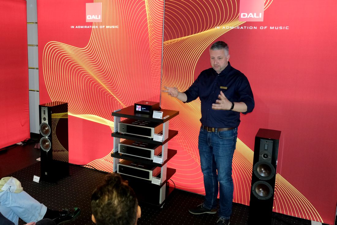 Auch wenn es von der Elektronik her nach großem Besteck ausgesehen hat, im Gegensatz zu den Deutsche HiFi-Tage 2025 in Darmstadt ging es hier in Leipzig bei der Vorführung von Mike Besser preislich sehr zivilisiert zu. Obenauf der kleine Streaming-Verstärker NAD M10 V3 für 2.600 Euro, der von den Standlautsprechern DALI Rubikore 6 für 5.000 Euro das Paar begleitet wurde. Rocken konnte diese HiFi-Anlage auf den Punkt, präzise und neutral, doch mit den oben sitzenden Bändchen auch ansprechend feinfühlig.