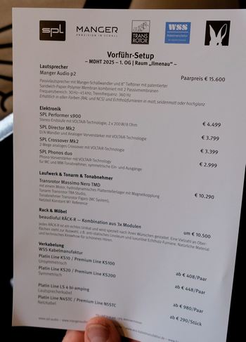 Also erstmal ein ganz großes Lob meinerseits für die Aussteller im Raum Illmenau! Nicht nur für den Klang, für den natürlich auch! Doch diese gehörten zu den sehr wenigen, die in der Lage waren, dem Interessenten eine Liste der vorgeführten Geräte mitsamt den Preisen in die Hand zu drücken, so mag ich das! Ich könnte euch das nun einfach ablesen lassen, doch bei diesem Service schreibe ich das hier gerne nochmal im Einzelnen ab, weil es so einfach und fix geht.