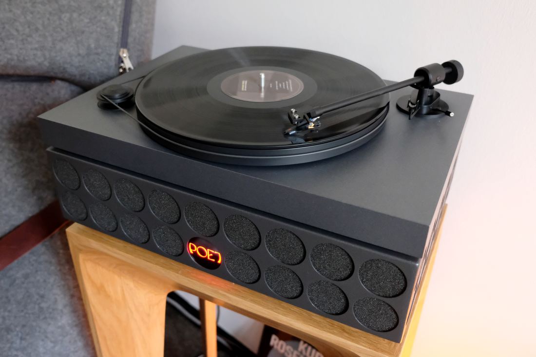 Im selben Raum noch eine interessante Konstruktion, der österreichische POET fonetta, der ab 3.800 Euro erhältlich ist. Montiert auf dem Drei-Wege Mono-Aktivlautsprecher, der für die HiFi-Welt mit Bluetooth und optional auch per Cinch verbunden wird, mit einem vibrationsentkoppelter Plattenspieler von ProJect.