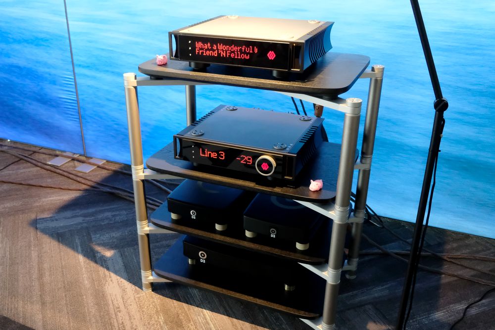 Obwohl die Breitbandlautsprecher Voxativ den Namen Alberich, das sind die kleineren in der Mitte, tragen, ist der Klang gar nicht mal so klein, ebenso wie der Paarpreis von 23.000 Euro. Der Vollverstärker T-211 für 24.000 Euro aus demselben Reich, wie auch der Streamer-DAC für 20.000 Euro.