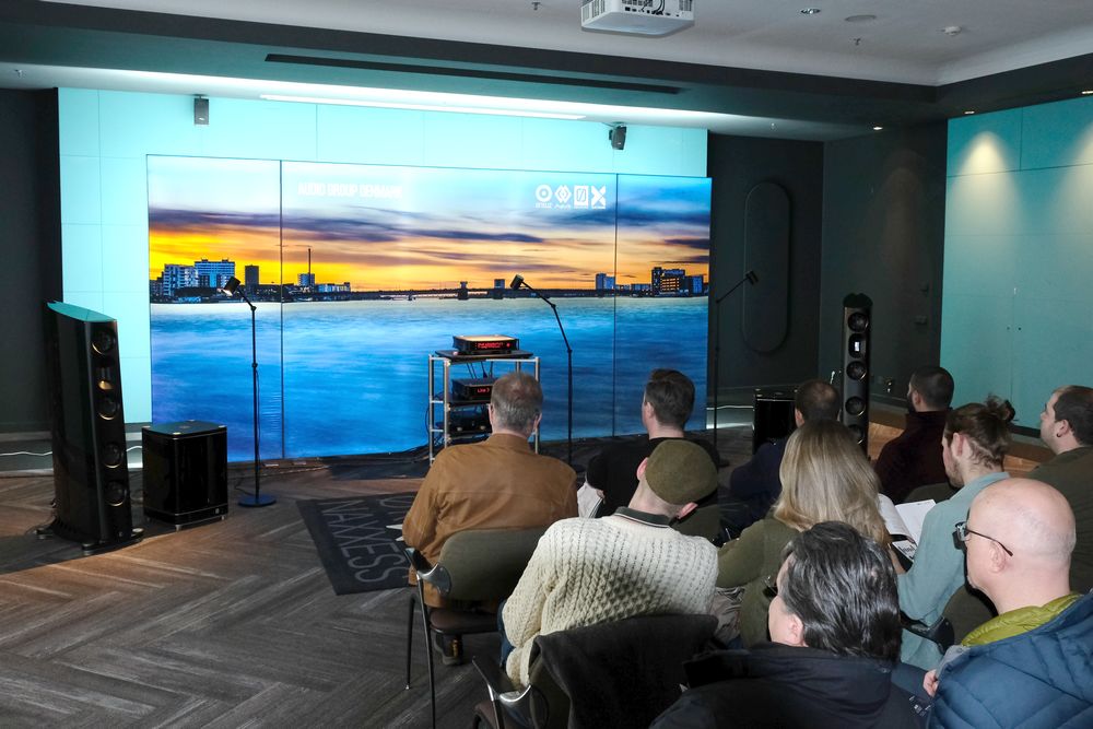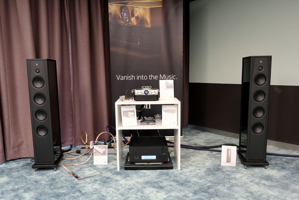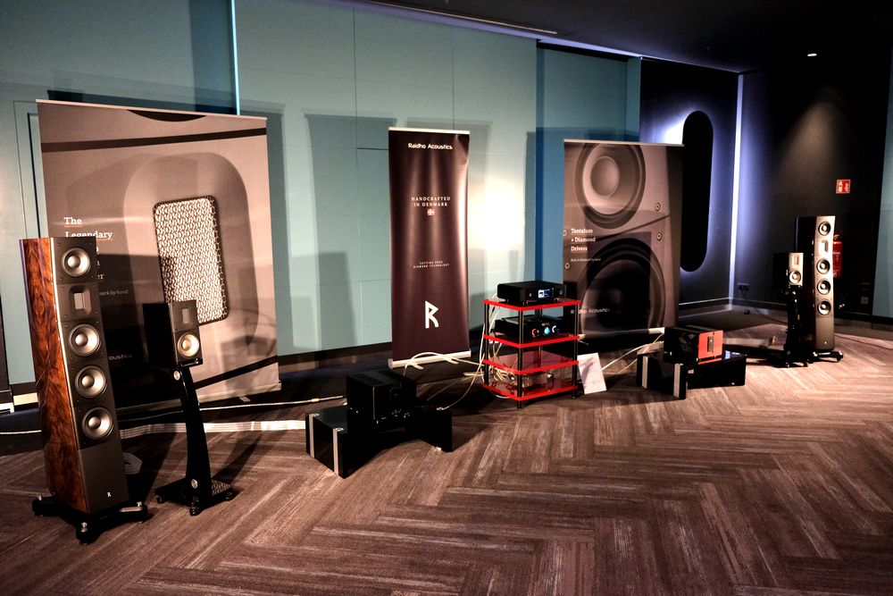 Lütt und Lütt, mit den Kompaktlautsprechern Raidho X1t für 6.000 Euro wurde hier der riesige Saal bespielt. Für jeden Lautsprecher zuständig eine Monoendstufe SPL Performer m1000 a‘ 5.200 Euro. Quelle ein Eversolo DMP-A10 und Vorverstärker Ultima Pre3 von Chord für 8.000 Euro.