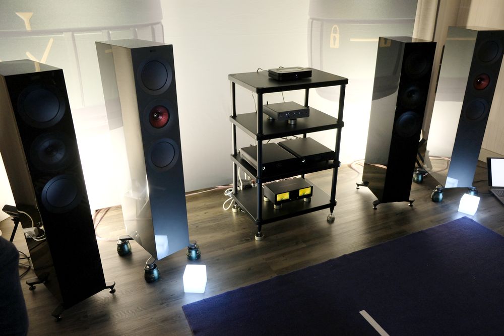 Bei Defini ging es nicht um die KEF R5, von denen gleich zwei Paar hier standen, wie man erst meinen konnte, sondern um Lautsprecherfüsse, oder genauer gesagt Dekoppler, die federgelagert funktionieren. Der „Effekt“ war schon verblüffend, die klanglichen Auswirkungen enorm in Bezug auf Bühne und Bass. Rund 1.800 für vier Dekoppler sind nicht ohne, dennoch überzeugend.