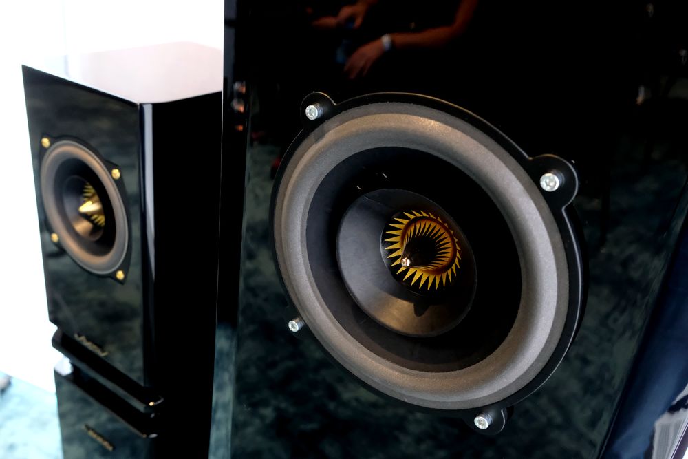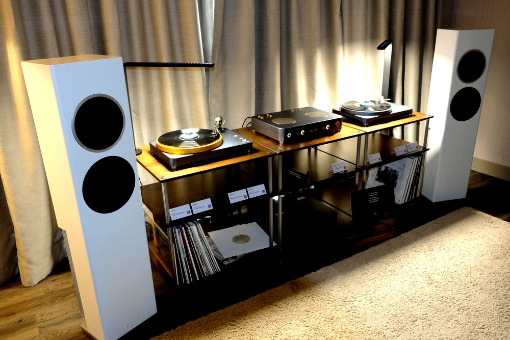 So oft sieht man Plasma-Hochtöner nicht. Doch zumindest auf den HiFi-Tagen, so wie hier bei den Lansche Audio No. 1.0 für 18.000 Euro. Wie so oft mit dabei der Reed Plattenspieler-Laufwerk Friction für 13.400 Euro mit 5T Tonarm für 16.000 Euro, der eine lasergeführte Azimuthkorrektur durchführt, Tonabnehmer ein Soundsmith AIDA für 2.200 Euro.