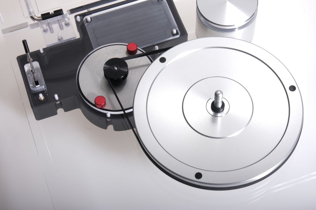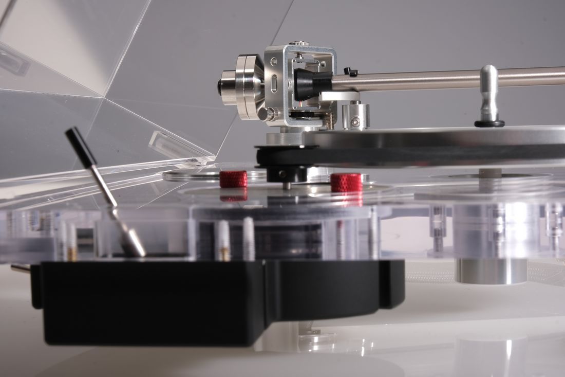 Ein charakteristisches Merkmal des Takumi 1.1 ist die mechanische Entkopplung von Schallplatte und Plattenteller vom Rest des Plattenspielers. Der Acryl-Plattenteller ist vom Aluminium-Unterteller und auch von der Spindel selbst entkoppelt.