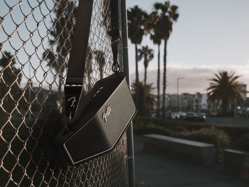 - 360°-Spritzwasserschutz nach IPX5, stoßfestes Gehäuse, seitliche Griffmulden und breiter Tragegurt in Fender Gitarrengurt-Optik