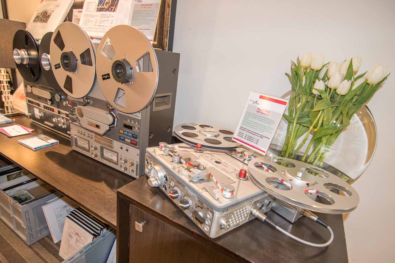 Von den Telefunken Tonbandmaschinen hatte ich bereits in meinem ersten Bericht erzählt. Diese lieferten einen angenehm analogen Sound zur Elektronik und den Lautsprechern von Sombetzki, was wunderbar zusammen harmonierte. Es spielten die Elektrostaten HOME Tandem (um 10.000 Euro), die von einem Paar Röhrenendstufen S509 (um 3.000 Euro / Stück) befeuert wurden, die wiederum von einem S PRE (gibt es in passiver (um 1.900 Euro) und aktiver Röhren-Variante (um 2.800 Euro)) kontrolliert wurden.