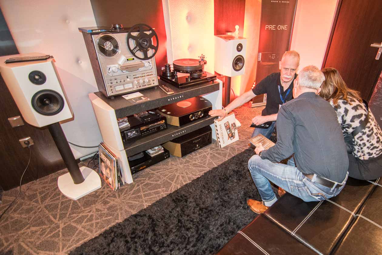 Unten im Bild eine HiFi-Anlage mit – für uns neu – klassischen HiFi-Komponenten aus dem Hause Divaldi: der Vorverstärker GOLD PRE ONE, die Endstufe GOLD PA ONE (um 21.000 Euro) auf dem eigenen Rack TAB (eine Ebene in der Preisklasse 1.500 Euro) sowie die MS-01 Monitor Speaker auf Stands (um 2.500 Euro / Stück).
