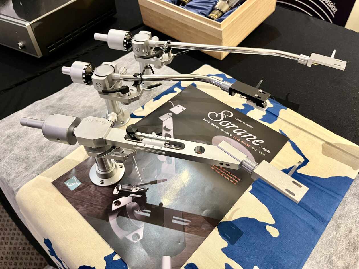 Analogforum-Moers-2026 Im Bild oben die feine Röhren-Elektronik von Air Tight, die eine Nahaufnahme wert war. Unten die ebenso feinen Tonarme von Sorane. Axiss sucht weltweit nach spannenden Herstellern. Phasemation, Air Tight und Sorane stammen aus Japan (mit an Bord auch Koetsu Tonabnehmer), Luna Cables aus Kanada.