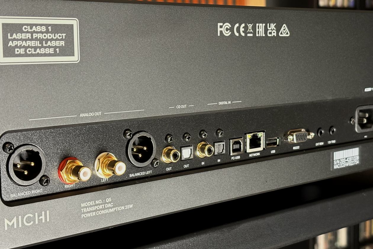 Das aktuelle, online herunterladbare Firmware-Update (V1.04) hat mittlerweile auch das Problem behoben, dass der koaxiale und optische Eingang nur bis 16 Bit/44,1 kHz wandeln konnten. Dies habe ich überprüft, indem ich meinen Musikserver NAD M50.2 per Koaxialkabel angeschlossen habe und dem Michi Q5 High-Resolution-Kost zugeführt habe – klappt, er verarbeitet über diese Schnittstellen jetzt auch Futter mit 24 Bit. SACDs wird der Michi Q5 allerdings nie abspielen können, weil „ein SACD-Laufwerk auf dem geforderten Qualitätsniveau nicht verfügbar war“, so Daren Orth. „SACD-Mechanismen basieren oft auf DVD-Technik, was die Auswahl an passenden Motoren, Lasern und Decodern einschränkt. Daher fiel die Entscheidung, ein eigenes CD-Laufwerk zu entwickeln – maßgeschneidert, präzise und frei von Kompromissen.“ Die Entwickler spendierten dem Q5 zudem zwei intern gefertigte Ringkerntransformatoren, die die digitale und analoge Spannungsversorgung separieren, was Rauschen und gegenseitige Störungen reduzieren soll.