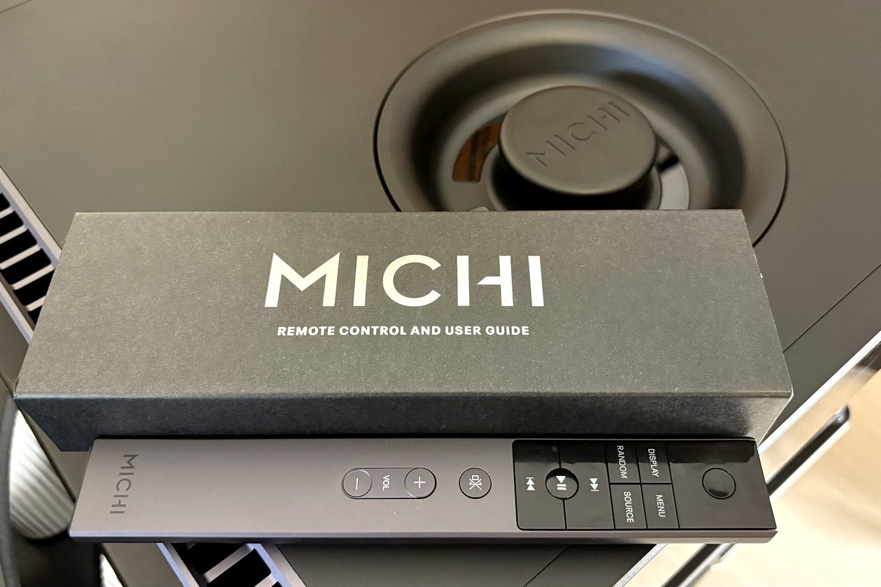 Denn die Vorderseite besteht aus Glas und weist bis auf den unten in der Mitte platzierten An/Aus-Schalter, der den Player in den Stand-by-Modus schaltet oder aus diesem erwachen lässt, keinerlei Bedienelemente auf. Unten rechts sieht man im Glas zwar ein paar Symbole für Source, Play, Stop und Skip vorwärts oder rückwärts, doch die Steuerungstasten dafür befinden sich direkt angrenzend an der Unterseite. Besonders in dunklen, wenig beleuchteten Räumen sind diese schwer zu sehen beziehungsweise zu erfühlen. Eine Platzierung der Tasten auf der Oberseite wäre intuitiver und praktischer gewesen, hätte aber vermutlich die cleane Optik gestört. Denn auch oben setzt sich der Purismus fort: Bis auf den schwer zu übersehenden Deckel mit MICHI-Schriftzug gibt es hier nichts zu sehen. Denkt man im ersten Moment. Denn schon das Anheben des massiven Deckels entpuppt sich als Aha-Moment, denn das gute Stück wiegt über ein Kilogramm! Ich überlege kurz, meine Doc Martens mit Stahlkappen anzuziehen, um meine Zehen zu schützen, falls mir das gute Stück auskommen sollte, beschließe dann aber, lieber vorsichtig und aufmerksam zu schleichen.