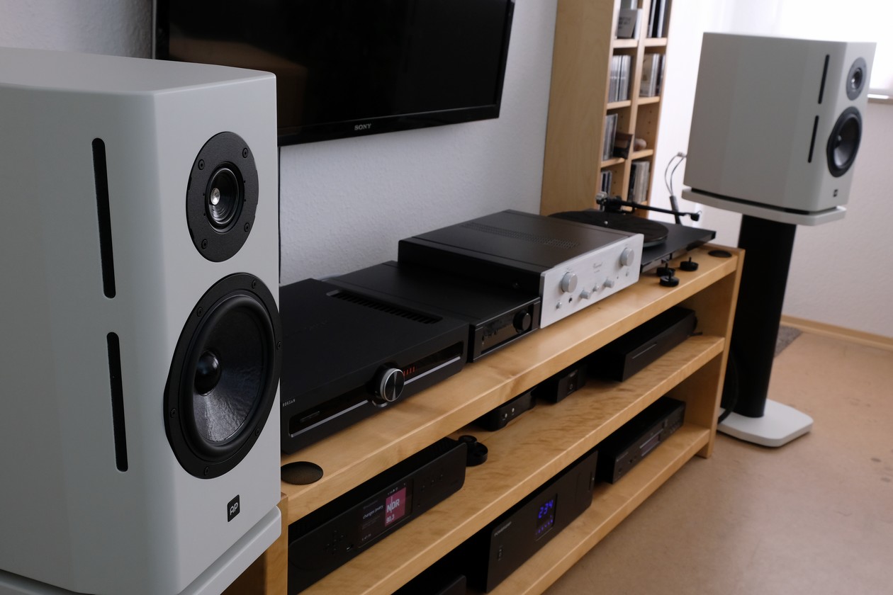 Dann die die klassische Frage: „Darf’s ein bisschen mehr sein?“, kann man ja nicht verneinen. Also von anfangs 65 cm Wandabstand über 50 cm lande ich bei rund 40 cm. Der Stehbass wächst nochmals und bekommt einen klasse Tiefgang, und das Schöne daran, da dröhnt nichts. Die Bogenstriche schnurren vor sich hin, wechselweise werden die Saiten auch liebevoll gezupft, sehr glaubwürdig erscheint mir der Korpus dieses großen Instruments. Also das mit dem Konzept des geschlossenen Lautsprechers und seinem Downfire-Bass geht bei meinen 20 qm bestens auf. Weiterhin leicht und locker hüpfen die Hämmerchen auf den Klaviersaiten, und auch dem fein aufgelösten Besen des Schlagzeugs macht das mehrfach erfolgte Hin- und Hergeschiebe der Lautsprecher nichts aus. Sehr natürlich erklingt dieser linkerhand, während auf der anderen Seite gelegentlich ein hingehauchtes „Dibidibidi“ aus den Kompaktlautsprechern an meine Ohren kommt.