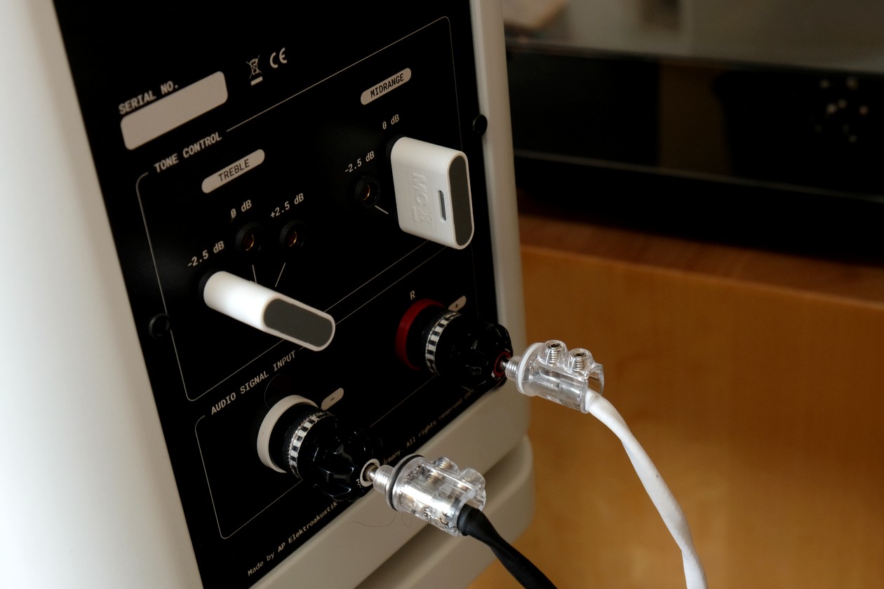 AP-Elektroakustik MONITOR 30P: WBT-Polklemmen und Steckbrücken zur Klanganpassung.