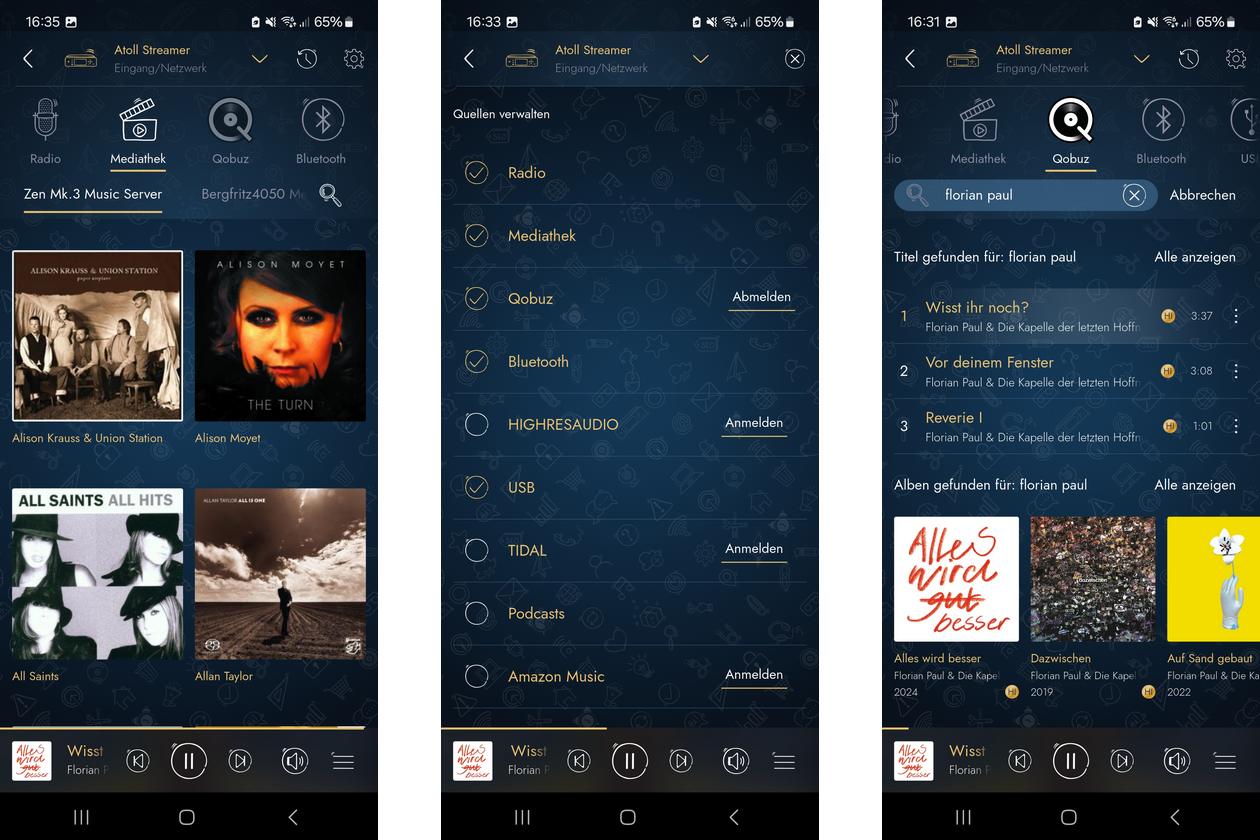 Beim DAC setzt Atoll nicht auf die allgegenwärtigen ESS Sabre, sondern auf einen BurrBrown PCM1792. Also völlig ausreichend für die gängigen Dateiformate wie FLAC, WAV, ALAC, und MP3 mit bis zu 24 Bit / 192 kHz sowie DSD 64 und DSD 128. Bei USB-Sticks und externen Festplatten akzeptiert der SDA 300 Signature FAT32, NTFS sowie EXT2/3/4. Beim Streaming zeigt sich der Netzwerkplayer gegenüber Qobuz, Tidal, Deezer und MQA offen. Weiterhin ist er Spotify- und Spotify Connect- sowie TIDAL Connect fähig, Roon Ready und Audirvana werden ebenfalls akzeptiert. Somit dürfte alles da sein, was das Herz begehrt.