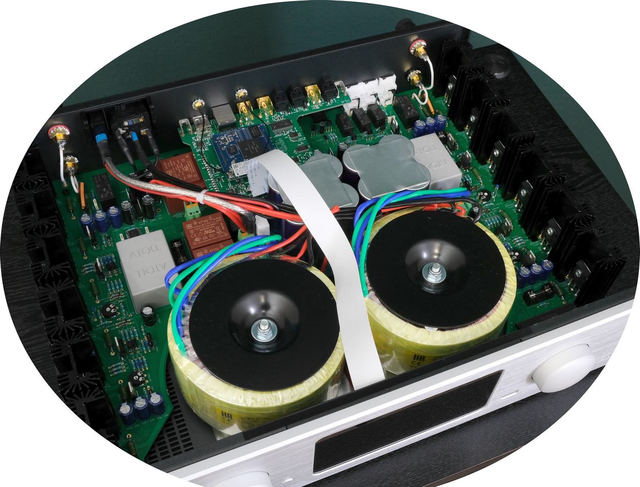 Dann mal auf mit dem Deckel: Bei den Innereien hält sich die Sparerei gegenüber den Euronen löblicherweise in Grenzen, wie man bei den beiden fetten Ringkerntrafos mit je 440 VA feststellen kann. Dazu gibt es links und rechts an den Kühlkörpern sechs MOS-FETs je Kanal, lecker in Doppelmono ist der französische Verstärker – der auch in Frankreich hergestellt wird – aufgebaut. Summasummarum ergibt das dann laut Hersteller respektable 2* 280 Watt an 4 Ohm, die an 65.800 µF Siebkapazität saugen dürfen.