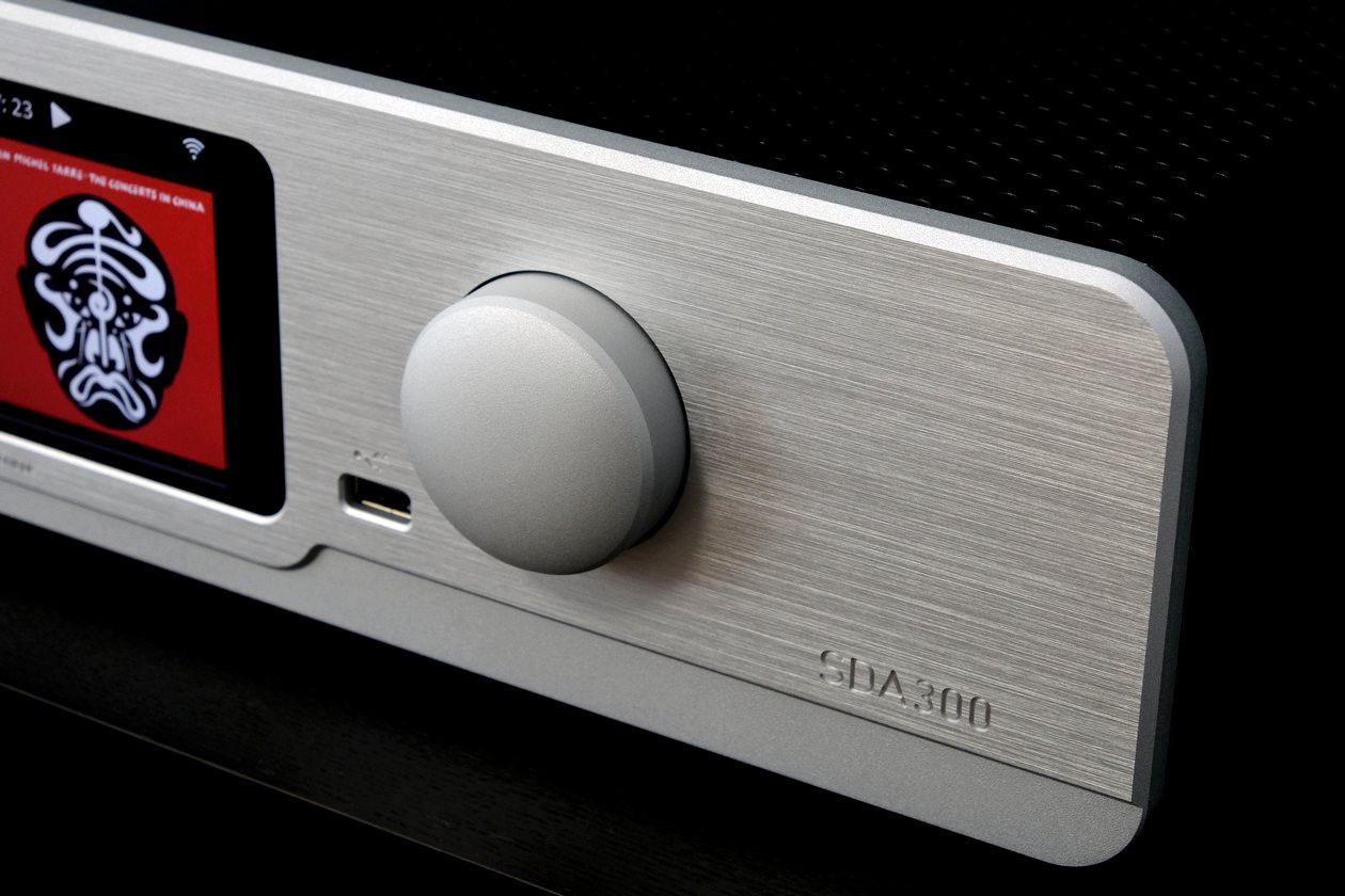 Von der Optik her dürfte der gerade bei mir zum Test anwesende Streaming-Verstärker meinem eingangs erwähnten Freundeskreis wohl gefallen. In einem in Schwarz gehaltenen Kleid aus Lochblech kommt er daher, seine 8 mm Aluminium-Front gibt es wahlweise in zeitlosem Schwarz, oder wie hier beim Testgerät in ebenso aufregendem Silber. Zentral angeordnet ist das große 5 Zoll messende Farbdisplay, das neben den Streaming-Covern in großer Schrift auch die Bezeichnungen der Eingänge aufzeigt. Und der SDA 300 Signature hat das, was ich bei anderen modernen Geräten gelegentlich vermisse: Zwei große und praktische Dreh- und Drückregler, rechterhand zum Ein- und Ausschalten sowie linkerhand für die Wahl der Eingänge wie aich der Einstellungen plus einer Returntaste. Vorzüglich lässt es sich so bereits ohne App durch die angebotenen Radiosender oder das Programm der Streaming-Anbieter wie auch eines angeschlossenen Musikservers scrollen, da kommt Freude auf. Und nicht zu vergessen: Für die ruhigen Stunden im Leben gibt es auf der Front auch noch eine 6,3 mm Klinkenbuchse für Kopfhörer.