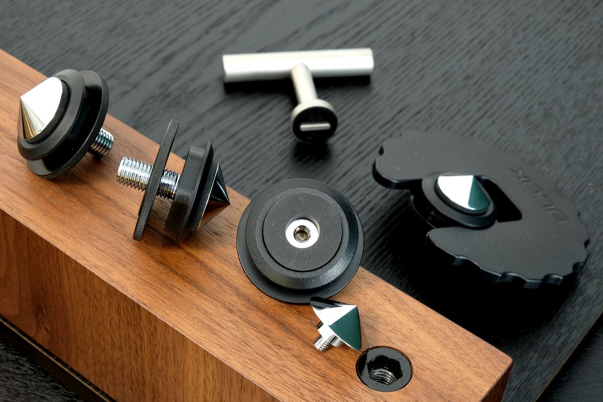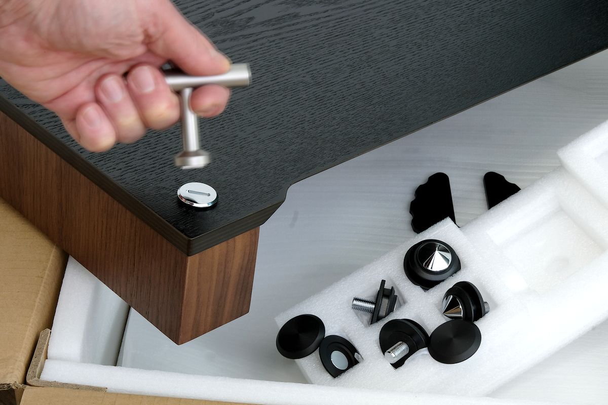 Bitte einmal umdrehen die Basis des HiFi-Racks um die höhenverstellbaren Füße einzuschrauben. Soll das Regal auf dem Parkett zu stehen kommen, dreht man die mit einer Gummisohle versehenen Füße einfach rein in die Stollen. Sind dagegen Spikes für den Teppichboden gewünscht, bitte diese vorher in das Gewinde, welches innerhalb der Gummifüße implementiert ist, reindrehen. Steht das Blok STAX 2G dann an seinem Platz, lassen sich dessen Füße mittels der ausgesparten schwarzen Scheibe noch in der Höhe verstellen und mit der Rändelscheibe in ihrer Höhenlage fixieren.