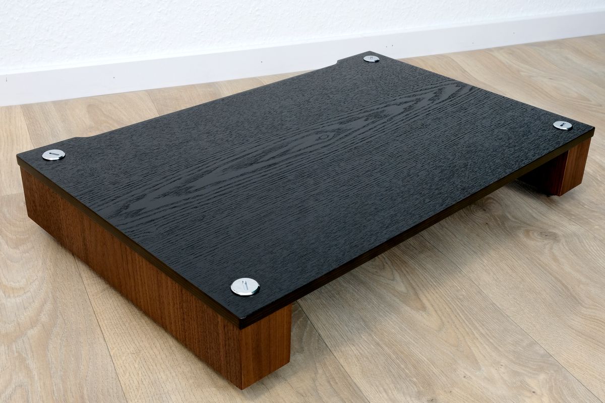 Ebenso wichtig wie die Technik ist natürlich die Optik so eines HiFi-Regals, schließlich soll es auch die Augen zufriedenstellen. Und da bietet das Blok STAX 2G drei Möglichkeiten an: Die mit bis zu 40 kg belastbaren Böden bestehen aus Sperrholz und sind wahlweise in Esche Natur furniert mit weißen Stollen, dann gibt es in Esche Schwarz furnierte Böden mit Stollen in Walnuss Natur wie im Test, oder Böden aus schwarzem Glas mit hochglanz schwarzen Stollen. Also optisch macht das schon was her, und dürfte mit den verfügbaren Möglichkeiten an Materialien zu den meisten Einrichtungen passen.