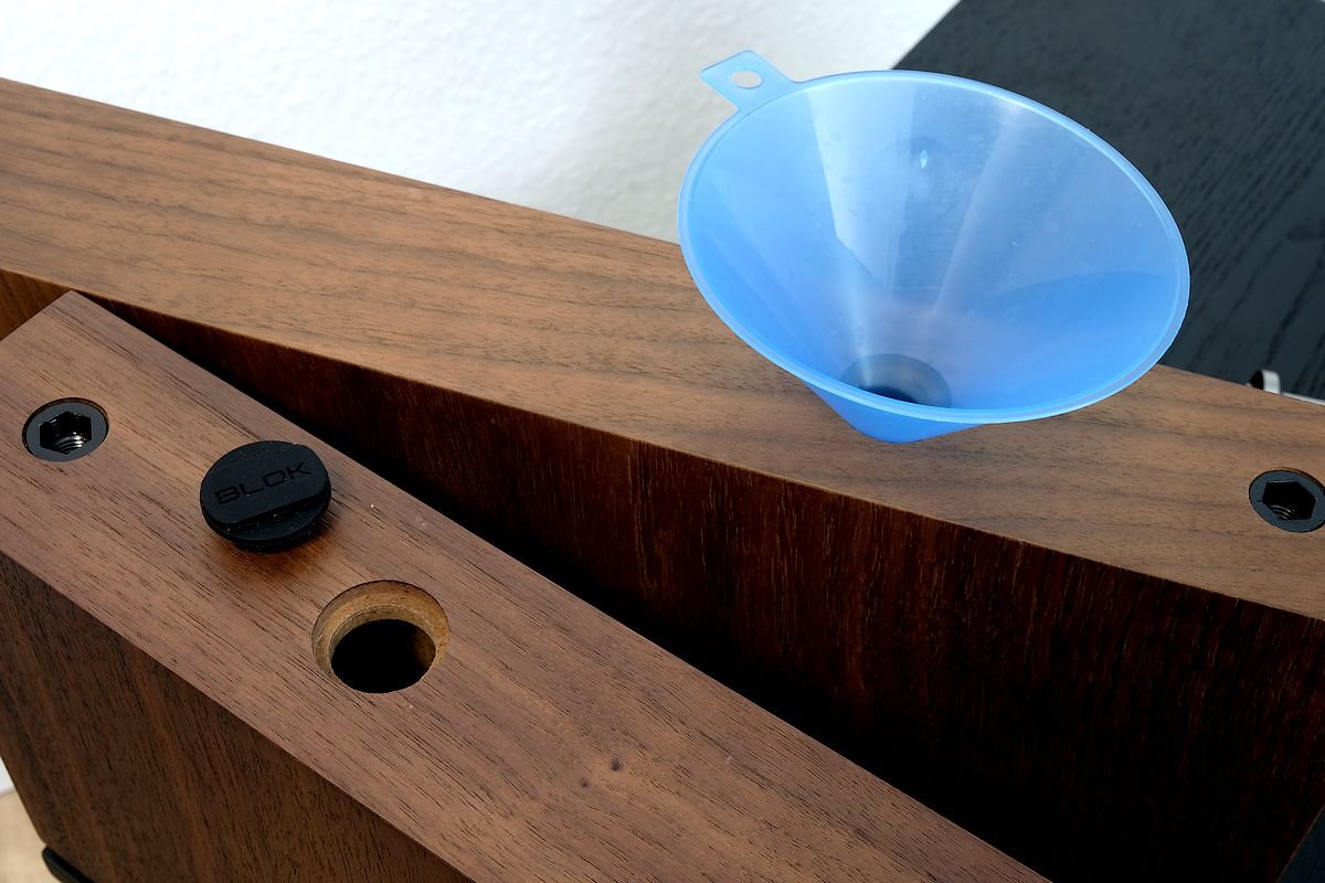 Raus mit dem Stopfen aus dem Stollen, getrockneter Quarzsand kann bei Bedarf und Wunsch noch in die Stollen eingefüllt werden. Das verkneife ich mir jedoch, sonst muss ich das Zeugs ja irgendwie wieder rausbekommen vorm Rückversand des HiFi-Möbels zum Vertrieb…