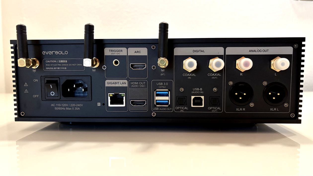 Im Inneren des Eversolo werkeln zwei ES9038Q2M-High-Fidelity-D/A-Wandler, wobei jeder der beiden DAC-Chips einen separaten Kanal übernimmt. Das soll laut Hersteller für maximale Präzision sorgen. Die Chinesen setzen hier generell auf eine vollständig symmetrische Schaltungsarchitektur ¬– von der D/A-Wandlung bis zum Ausgang. Da der Eversolo DMP-A6 Gen 2 nicht nur als Streamer, sondern auch als DAC und Vorverstärker dienen kann, befinden sich auf seiner Rückseite zahlreiche Anschlüsse: Externe Geräte können ihn per HDMI-ARC- oder USB-B-Schnittstelle sowie optischem und koaxialem Eingang als Wandler verwenden. Streaming gelingt über die beiden rückseitigen Stummelantennen drahtlos oder kabelgebunden über die Gigabit-Lan-Buchse, hochauflösendes Bluetooth befindet sich selbstverständlich auch an Bord. Raus geht’s nicht nur analog, wobei es auch symmetrische XLR-Ausgänge gibt, sondern auch digital: 1 x optisch und 1 x koaxial. Hinzu kommen ein HDMI-Audioausgang für die DSD-Native- und die 5.1-Multichannel-Ausgabe und ein USB-Audioausgang. Lediglich analoge Eingänge fehlen, ein Plattenspieler kann also beispielsweise nicht andocken.