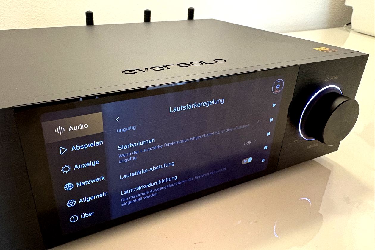 Auf den ersten Blick wirkt unser Testgerät unauffällig, was auch an seinen überschaubaren Abmessungen von 270 mm x 90 mm x 187 mm (B x H x T) liegt. Schaltet man es dann jedoch ein, erweist sich der sechs Zoll große Touchscreen mit nun optimierter Farbgenauigkeit als Blickfang – schön groß, sehr hochauflösend und vielseitig einstellbar. Natürlich kann man den Chinesen auch über die für Apple- und Android-Geräte erhältliche App steuern, den Autor dieser Zeilen zog es jedoch häufig zum Touchscreen, weil dieser einfach toll aussieht und absolut zuverlässig funktioniert. Wer möchte, kann sich als zusätzliche Steuerungsmöglichkeit die Eversolo-Fernbedienung BTR-12 für rund 30 Euro bestellen. Auch das schwarze Gehäuse wirkt zunächst unspektakulär, bei näherer Betrachtung erweist es sich aber – besonders im Hinblick auf die Preisklasse – als sehr gut verarbeitet und auch relativ schwer. Kein Wunder: Das CNC-gefertigte Vollaluminium-Gehäuse erreicht laut Hersteller Luft- und Raumfahrtqualität, soll Störeinflüsse minimieren und wirkt so robust, als könnte es selbst einen Klingonen-Angriff überstehen. Leider ist die matte Oberfläche sehr anfällig für Fingerabdrücke – auch das muss erwähnt werden.
